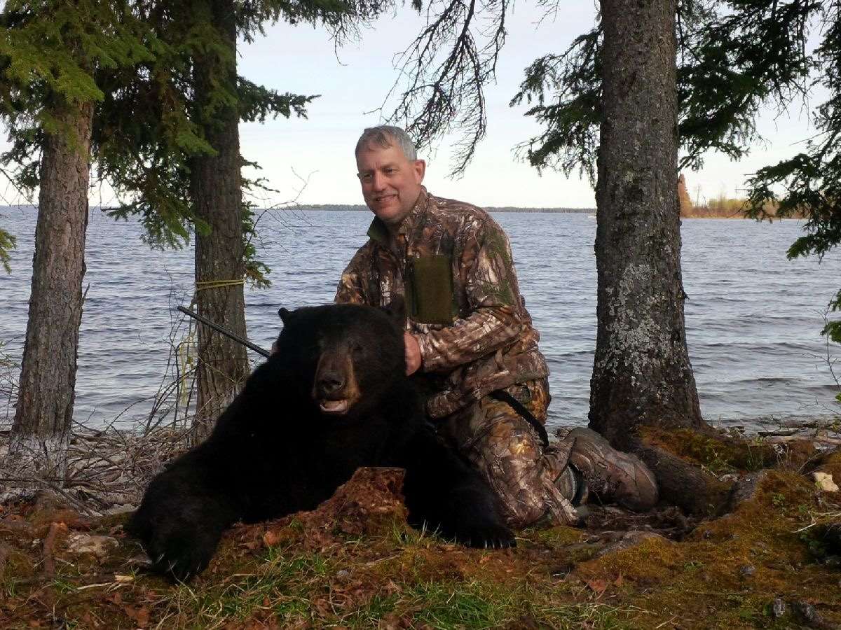 We offer guided bear hunts for trophy black bears over bait sites in our exclusive non-resident hunting area which is 500,000 acres (over 700 square miles). We have a very healthy population of bears in our area including many trophy bears and a variety of color phases, including chocolate, cinnamon, blonde and other variations. Our remote hunting area has vast amounts of rich forests, lakes, creeks, swamps, and cuts which allows bears to mature and grow to trophy size. Spring hunts typically start the third week of May, and fall hunts start at the end of August or start of September. The Manitoba rule is to have a minimum one guide for every three hunters. In many cases we will have two hunters per guide but it is also common for us to be one on one with the hunter. Hunters typically see many bears and have multiple chances to harvest a mature bear. We spend the time with you to understand what it takes for your hunt to be considered a success and we do everything possible to meet those goals. It is very common to get an opportunity at your target bear but it is up to you to make a lethal shot on the animal. Sometimes mother nature can put a damper on your hunt but we can assure you that our rule is to do everything in our power to make your hunt successful.